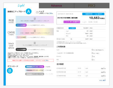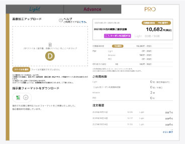 - ① マイページの[Light]タブから、補正したい画像をご希望の仕上がりのアップロード先(RGBまたはCMYKまたはモノクロ)にアップロードすると画像補正の注文受付メールが届きます。