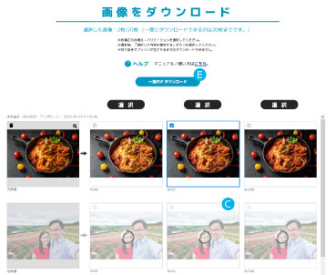 - ⑥-2 【画像補正ありの場合】 ダウンロード画面のバリエーション3種の中からご希望の画像を選び、選択した内容を確定するGボタンを押すと画像補正された切り抜き画像がダウンロードされます。