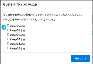 - ② 画像をアップロードすると切り抜きオプションの注文申し込み画面が表示されるので、切り抜きを依頼したい画像の左側のチェックボックスHにチェックを入れて確定ボタンを押してください。