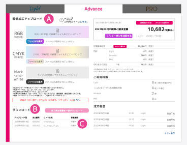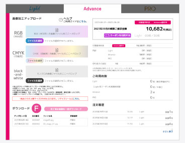 - ① マイページの[Advance]タブから、補正したい画像をご希望の仕上がりのアップロード先(RGBまたはCMYKまたはモノクロ)にアップロードすると画像補正の注文受付メールが届きます。