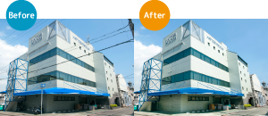レタッチ内容/建物左右にある電柱とその間の電線、建物前の道路標識を除去